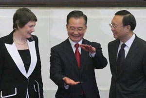 | 中國國務院總理溫家寶(中)、新西蘭總理克拉克(左)、中國外交部部長楊潔篪(右)出席簽字儀式。新華/路透圖 | 《中國政府和新西蘭政府自由貿易協定》昨天(4月7日)正式簽署。這是中國與其他國家簽署的第一個全面的自由貿易協定,也是我國與發達國家達成的第一個自由貿易協定。
