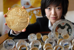 本報訊 由北京奧組委授權、中國印鈔造幣總公司發行的北京2008年奧運會火炬接力紀念章將于近期上市發售。該紀念章共有5種規格,所有產品均分別采用999純金和999純銀鑄造而成,限量發售。據介紹,此款紀念章的正面為每個火炬傳遞城市的彩印形象,這在奧運藏品領域尚屬首次。