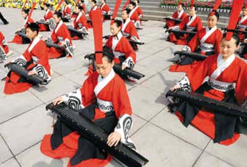 4月9日,首屆中國鄭州炎黃文化周在鄭州黃河風景名勝區炎黃廣場開幕。此活動以“萬龍歸宗、祈福中華”為主題,弘揚中華優秀傳統文化。圖為演員在開幕儀式上彈奏古琴。
