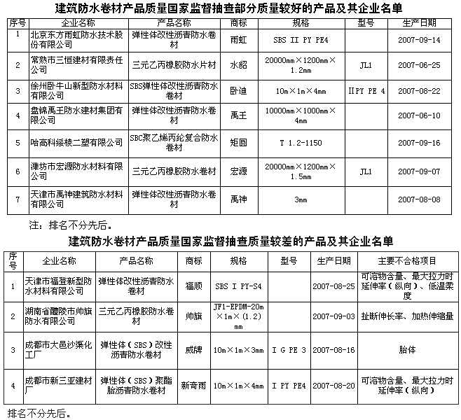 為保障建筑工程材料產品質量,維護消費者的合法權益,促進建筑防水卷材行業健康發展,國家質檢總局組織對建筑防水卷材產品質量進行了國家監督抽查,共抽查了北京、河北、天津、遼寧、吉林、黑龍江、河南、湖南、湖北、四川、重慶、陜西、山東、安徽、江蘇、浙江、上海等17個省、直轄市81家企業生產的84種產品(不涉及出口產品),產品實物質量抽樣合格率為94.6%。 此次抽查依據強制性國家標準GB18242-2000《彈性體改性瀝青防水卷材》、GB18173.1-2006《高分子防水材料