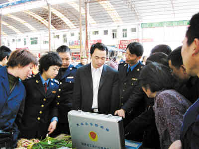 編碼管理系統的應用讓工商監管得心應手,圖為郴州市工商局局長歐陽志剛(左四)檢查集貿市場。 | 工商管理工作需要有一定的經濟信息作保障,如今只要你打開郴州市工商系統的任何一臺電腦,全系統11個縣市區82個工商所的管轄范圍、市場監管、兩費征繳等情況一目了然,這是郴州市工商局從2005年開始提升市場監管水平、加強市場監管效能上實行編碼管理取得的有益嘗試。 “在基層工商所過去是90%在收費,只有‘收費能手’,沒有辦案骨干;如今則是90%搞監管,主要職能加強監管,工商管理水平得到了極大提高”。郴州市工商局局長歐陽志剛對改革創新的編碼管理系統頗有一番感慨。