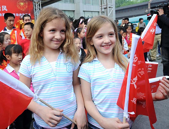 4月19日,百對雙胞胎“迎奧運、講文明、樹新風,爭做好市民從我做起”活動在天津舉行。圖為一對來自英國的8歲雙胞胎姐妹在活動上。