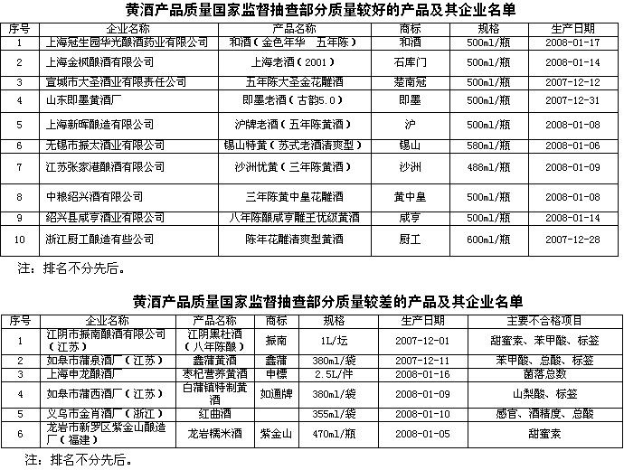 2、個別產品違規添加甜味劑或防腐劑。強制性國家標準GB2760-1996《食品添加劑使用衛生標準》規定,黃酒中不得添加甜味劑(糖精鈉、甜蜜素)、防腐劑(苯甲酸、山梨酸)。抽查中有個別產品檢出甜蜜素、苯甲酸和山梨酸。