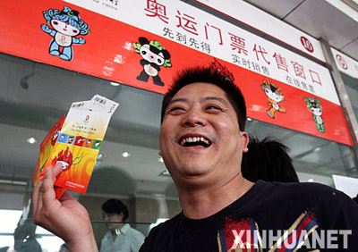 5月5日,在中國銀行阜陽分行奧運門票代售點,一名市民展示剛購買的奧運門票。當日,北京奧運會第三階段門票銷售正式啟動。由于這一階段采取“先到先得”的售票原則,公眾購票熱情十分高漲。 新華社發