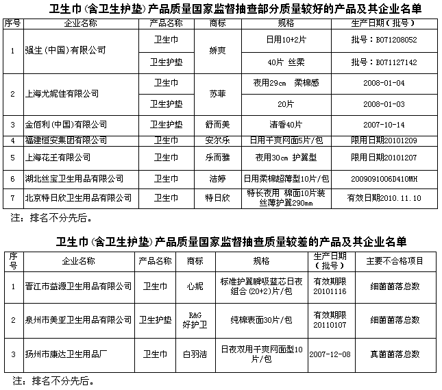 為維護消費者的合法權益,促進衛生制品行業健康發展,國家質檢總局組織對衛生巾(含衛生護墊)產品質量進行了國家監督抽查。共抽查了北京、天津、上海、江蘇、安徽、廣東、浙江、福建、江西、湖北等10個省、直轄市108家企業生產的120種產品(不涉及出口產品),產品實物質量抽樣合格率為97.9%。