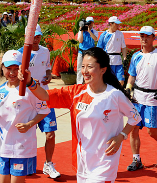 | 圖為火炬手楊揚在海南三亞進行火炬傳遞。新華社記者 丁林