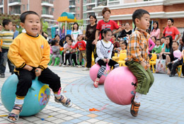各種形式的趣味運動會近日在福州市的社區陸續展開,人們以歡快活潑的趣味比賽迎奧運。圖為福州金山吉龍社區的小朋友在社區趣味運動會中進行跳球接力比賽。