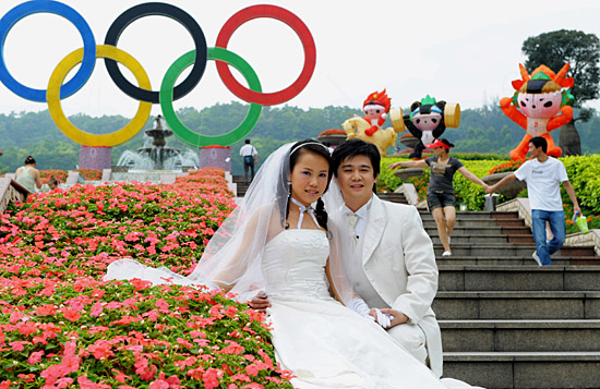 隨著奧運圣火開始在國內傳遞,廣州市內的奧運氣氛愈發濃郁,很多新人選擇拍攝帶有奧運元素的婚紗照。圖為一對新人在廣州云臺花園內以奧運五環和福娃模型為背景拍攝婚紗照。