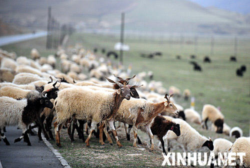下圖為:5月5日,羊群正在穿越甘肅省甘南藏族自治州夏河縣一條草原公路。