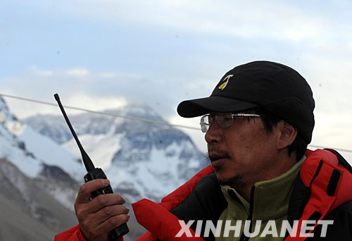 5月8日,北京奧運火炬接力珠峰傳遞登山隊總指揮李致新在珠峰大本營通過對講機與登頂隊員聯系。當天,北京奧運火炬接力珠峰傳遞成功登頂珠峰。 |