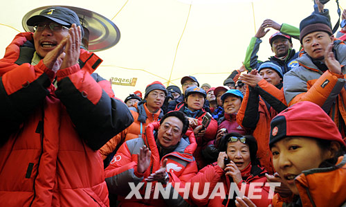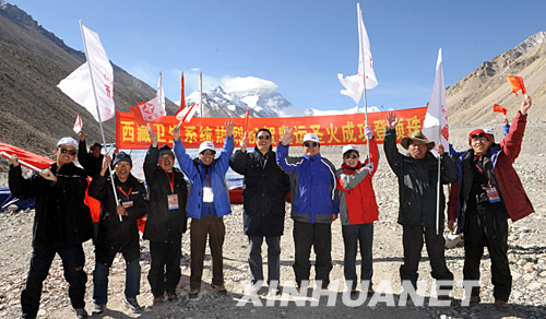 5月8日,北京奧運火炬珠峰傳遞衛生保障醫療人員在珠峰大本營慶祝奧運火炬成功登頂珠峰。當天,北京奧運圣火珠峰傳遞登山隊成功登頂珠峰。 |