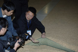 記者隨機來到32號倉前,這幢倉庫看起來約有兩層樓高,密封嚴實,順著倉庫外的狹窄鐵樓梯,記者攀到窗戶大小的進倉口,貓著腰進到糧倉,放眼望去,整個倉庫約有半個足球場大,腳下鋪滿一塵不染的塑料布,倉庫的頂梁就在面前。在倉庫入口的墻上掛著倉庫管理卡和糧情日志等記錄本,從記錄上得知,這個倉庫存放的是2005年收購進來的二等小麥,存量為3571噸。在倉庫保管員的指導下,記者掀開了腳下的塑料布、薄膜、隔熱墊、纖維板四層材料后,方才見到庫存小麥。小麥麥粒飽滿,呈褐黃色,抓起一把在手中微有些涼意。