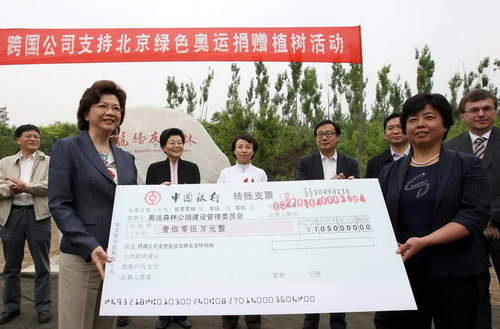 5月9日,“跨國公司支持北京綠色奧運捐贈植樹活動”在奧林匹克森林公園舉行,包括西門子、摩托羅拉、安利在內的16家跨國公司向北京奧運會捐贈105萬元人民幣。