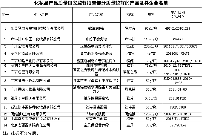 為了維護消費者的合法權益,促進化妝品行業健康發展,國家質檢總局組織對化妝品產品質量進行了國家監督抽查,共抽查了北京、上海、浙江、江蘇、廣東、福建等6個省、直轄市62家企業生產的80種產品(不涉及出口產品),產品實物質量抽樣合格率為99.7%。
