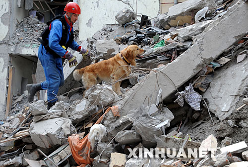 5月18日,俄羅斯救援隊員在廢墟中用搜救犬搜索幸存者。