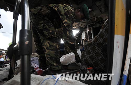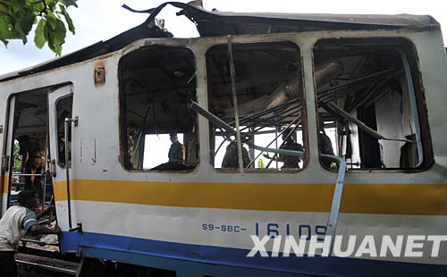 5月26日下午,一列客運火車在駛進斯里蘭卡首都科倫坡南郊代希瓦勒火車站時,放置在火車內的爆炸物被引爆,造成至少7人死亡,62人受傷。斯軍方認為,爆炸是反政府武裝泰米爾伊拉姆猛虎解放組織(猛虎組織)所為。圖為被炸毀的火車車廂。 新華社發