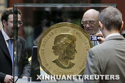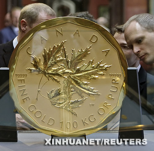 這枚金幣純度達99.999%,面值為100萬加元(約合100萬美元)。這種厚3厘米、直徑為53厘米、重達100公斤的巨無霸加拿大楓葉金幣,目前全世界僅有5枚。 新華社/路透