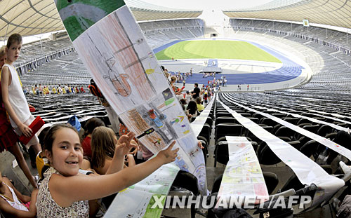 6月3日,在德國首都柏林的奧林匹克體育場,孩子們展示長達3.7萬米的畫卷。