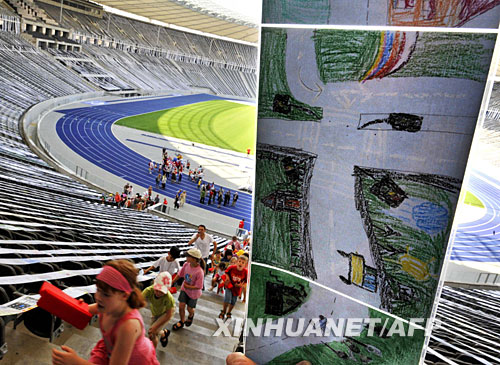 6月3日,在德國首都柏林的奧林匹克體育場,孩子們從長達3.7萬米的畫卷旁走過。新華社/法新