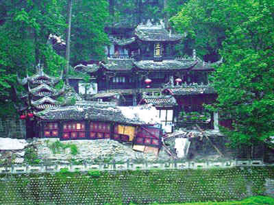 | 著名的二王廟隨山體滑坡垮塌 | “這甚至比一場戰爭的破壞都大!”站在因地震垮塌的二王廟一片殘垣斷壁旁,國家文物局副局長童明康滿臉焦慮、連聲哀嘆。 截至5月23日,5·12大地震共造成四川省接近3/4的全國重點文物保護單位不同程度受損——128處中有79處受損,另外還有169處省級文物保護單位遭受不同程度的損失;館藏文物方面,損失達1839件,其中珍貴文物151件。初步估算,整個四川文物系統經濟損失達600多億元。 為第一時間對受災文物提出搶救方案,近日,國家文物局派出一支由國內頂級古建筑修復專家組成的專家團趕赴四川災區考察。 凌云寺藏經樓墻體開裂,大雄寶殿報身佛背光左下部脫落;眺望樂山的最佳景觀——烏尤寺景云亭基座有三面出現了垂直線裂縫,最寬裂縫達5厘米;鐘亭博脊出現裂縫,地面下沉;青衣別島處翹角脫落。而在峨眉山古建筑群,磚殿內小佛像掉落、損毀,窗子開裂;萬年寺屋面瓦片滑落,水管破裂;圣積寺銅塔塔剎掉落;報國寺佛像脖子斷裂。 目前中國列入世界遺產名錄的35處中,四川省有4處,位列全國三甲,除了世界文化遺產1處(青城山—都江堰),還有世界自然和文化雙重遺產1處(峨眉山·樂山大佛),以及兩處世界自然遺產