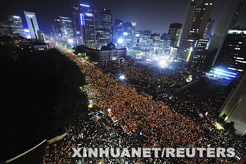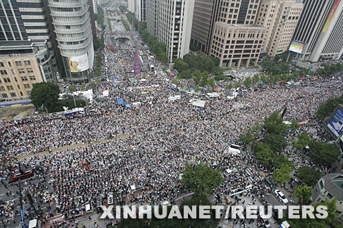 因擔憂進口美國牛肉可能給韓國帶來瘋牛病隱患,約100萬韓國人當天走上街頭參加抗議。韓國今年4月與美國達成開放市場進口美國牛肉協議,但遭到國內強烈反對,引發一系列抗議活動。 新華社/路透