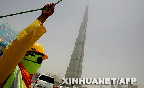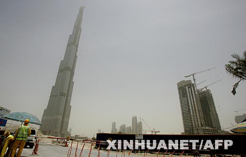 迪拜塔項目的開發商當天稱,迪拜塔的完工時間將由原定的2008年年底推遲至2009年9月。2004年9月動工的迪拜塔在2008年4月高度達到629米,成為世界最高建筑。為防止競爭者超越,迪拜塔的最終高度一直沒有公布。 新華社/法新