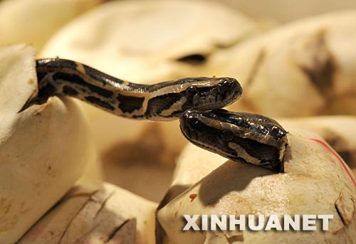 海南東盛弘公司人工孵化的幼蟒正在出殼(6月7日攝)。