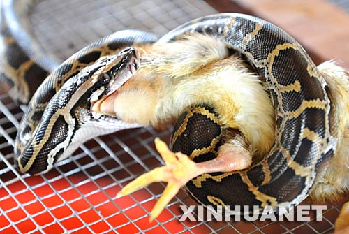 人工孵化的幼蟒在吞食小雞(6月7日攝)。幼蟒從出殼第4天至4個月之間都以小雞為食。
