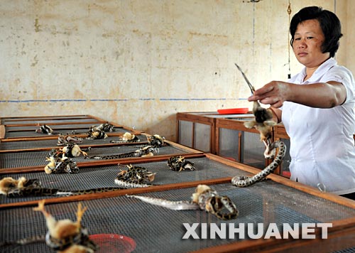 海南東盛弘公司的工人用小雞喂養人工孵化的小蟒蛇(6月7日攝)。