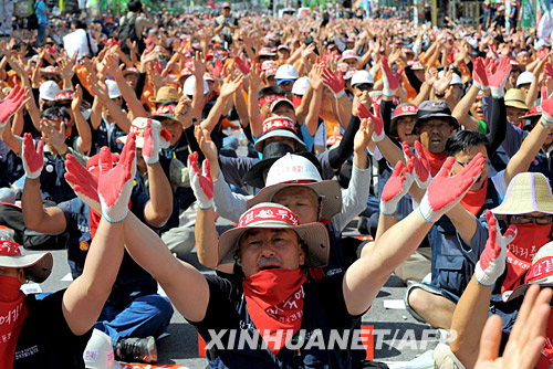 6月16日,韓國首爾的集會者舉著各自工會的旗幟,抗議油價不斷攀升。新華社/法新
