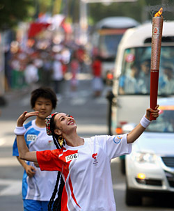 | 6月17日,火炬手阿布都克力木熱娜手持火炬傳遞。當日,北京奧運圣火在新疆烏魯木齊傳遞。新華社記者 邢廣利