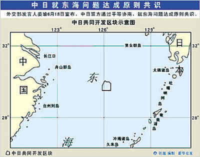 外交部發言人姜瑜18日宣布,中日雙方通過平等協商,就東海問題達成原則共識。 一、關于中日在東海的合作 為使中日之間尚未劃界的東海成為和平、合作、友好之海,中日雙方根據2007年4月中日兩國領導人達成的共識以及2007年12月中日兩國領導人達成的新共識,經過認真磋商,一致同意在實現劃界前的過渡期間,在不損害雙方法律立場的情況下進行合作。為此,雙方邁出了第一步,今后將繼續進行磋商。 二、中日關于東海共同開發的諒解 作為中日在東海共同開發的第一步,雙方將推進以下步驟: 。ㄒ唬┯梢韵赂髯鴺它c順序連線圍成的區域為雙方共同開發區塊(見上圖): 北緯29°31′,東經125°53′30″;北緯29°49′,東經125°53′30″;北緯30°04′,東經126°03′45″;北緯30°00′,東經126°10′23″;北緯30°00′,東經126°20′00″;北緯29°55′,東經126°26′00″;北緯29°31′,東經126°26′00″ 。ǘ╇p方經過聯合勘探,本著互惠原則,在上述區塊中選擇雙方一致同意的地點進行共同開發。具體事宜雙方通過協商確定。(三)雙方將努力為實施上述開發履行各自的國內手續,盡快達成必要的雙邊協議。(四)雙方同意,為盡早實現在東海其它海域的共同開發繼續磋商。 三、關于日本法人依照中國法律參加春曉油氣田開發的諒解 中國企業歡迎日本法人按照中國對外合作開采海洋石油資源的有關法律,參加對春曉現有油氣田的開發。 中日兩國政府對此予以確認,并努力就進行必要的換文達成一致,盡早締結。雙方為此履行必要的國內手續。 |