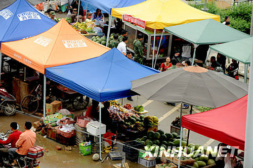 6月19日,群眾在青川縣縣城濱江道上的帳篷市場一條街上購物。四川省青川縣在受災群眾安置集中地點——青川縣城濱江道設立帳篷市場一條街,滿足受災群眾的生產生活實際需要。