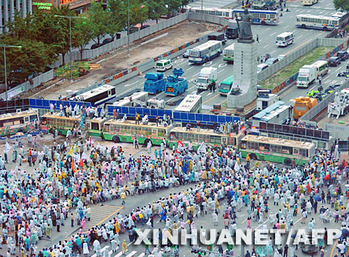 6月22日,在韓國首都首爾,示威者用繩索拖動阻擋人們通過的巴士。新華社/法新