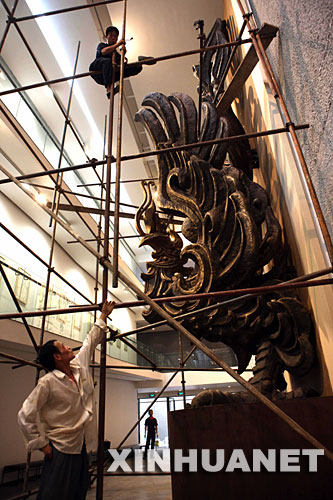 6月23日,工人在拆除一座雕塑的腳手架。