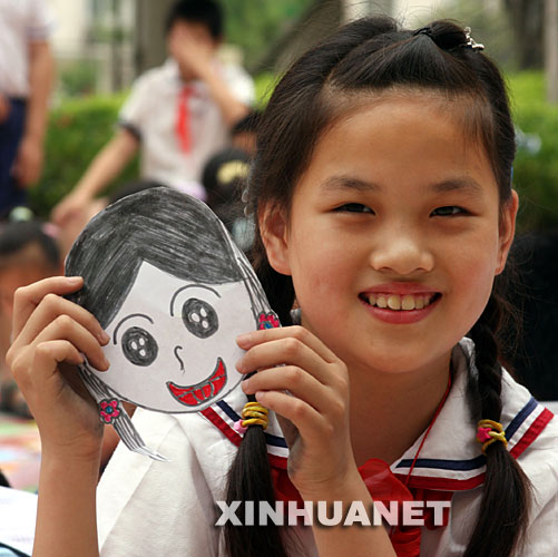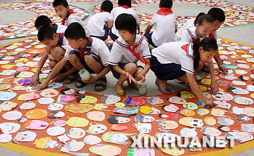 6月22日,學生們往奧運五環里貼“笑臉”。