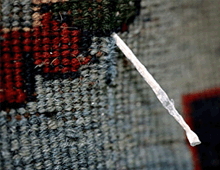 三塊看似平常的手工編織地毯,絨面平整,底面編織均勻,破拆后發現其中穿插織入了許多細長的柱狀針織物,剝開它們最外層的羊毛纖維,里面是一根直徑約