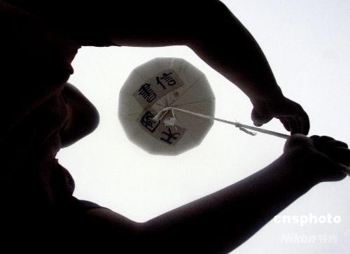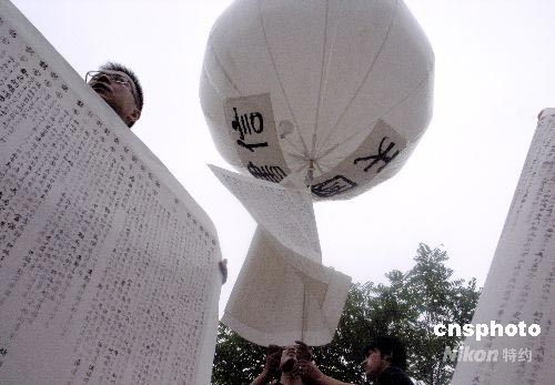 6月29日下午2點28分,北京藝術家朱永靈在北京798藝術區為四川地震遇難者放飛“天國書信”。這些書信摘抄自汶川大地震紀念館網站上網民為地震遇難者所寫的留言。