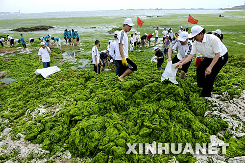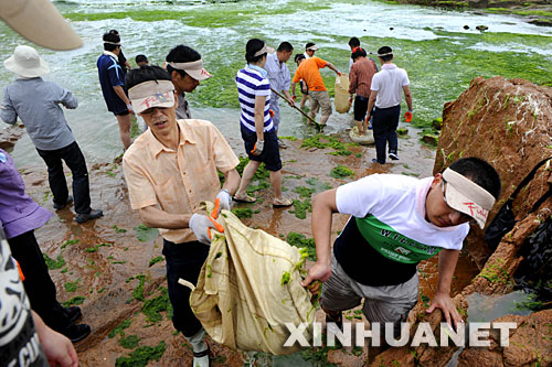 6月30日,一些大學生在青島前海海岸清理滸苔。 |