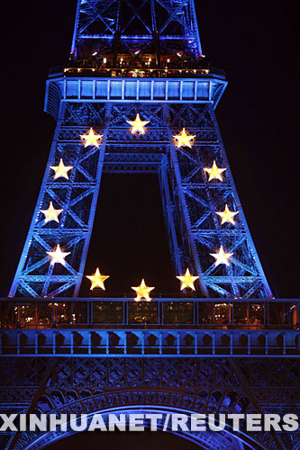 6月30日,法國首都巴黎市中心的埃菲爾鐵塔點亮象征歐盟旗幟的藍底金星燈光,慶祝法國從7月1日起接替斯洛文尼亞擔任為期半年的歐盟輪值主席國。新華社/路透