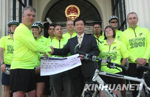 6月30日,在位于英國倫敦的中國大使館門前,中國駐英使館代辦張立榮(前中)與前來為中國四川地震災區捐款的英國伯明翰中國城的片警合影。當日,伯明翰中國城的13名片警騎車180公里來到這里,向張立榮遞交他們為中國四川地震災區募捐的7559.38英鎊(約合人民幣10.33萬元)款項。