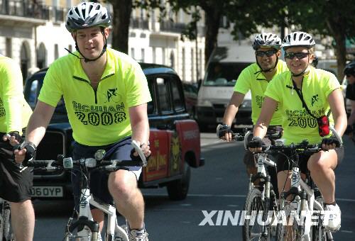 6月30日,在英國首都倫敦,來自伯明翰中國城的幾名片警騎車前往中國大使館遞交地震捐款。