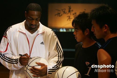 7月3日,NBA球星吉爾伯特·阿里納斯在上海出席阿迪達斯2008夏季籃球聯賽全國總決賽開幕式,一支來自汶川的高中籃球隊得到了吉爾伯特·阿里納斯的特別“照顧”,傳授球技、合影留念,吉爾伯特·阿里納斯(左三)和這些小球員來了個“親密接觸”。