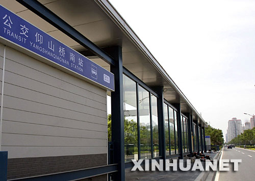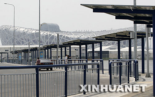 7月13日在北京奧運會主體育場“鳥巢”附近拍攝的新建成的公交車站。