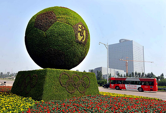 [進入北京奧運會專題] 沈陽奧體中心附近的一條街道上,矗立著一個以足球為造型的花卉雕塑。隨著奧運會開幕日期臨近,在北京奧運會分賽場之一的沈陽市,無論是城區還是旅游景點,到處都能感受到濃郁的奧運氛圍。