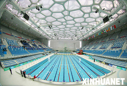 在奧林匹克公園景觀大道西側,國家游泳中心像一座藍色的水晶宮殿,無論在陽光下,還是在燈光下都透射著夢幻般的色彩。藍天白云的映襯下,淡藍色的泡泡似乎融在了一片蔚藍的海洋中,水的神韻得到完美體現,與位于其東側的“鳥巢”—國家體育場的陽剛雄渾之美相對,“水立方”展示的是以水為主題的陰柔與秀美。 作為世界上唯一一個完全由膜結構來進行全封閉的公共建筑,她晶瑩剔透的“方形”水泡營造出一種輕靈、寧靜、具有詩意的氛圍,讓觀眾流連忘返!八⒎健迸c“鳥巢”。一方一圓,一陽剛一柔美,把奧林匹克公園主場區的氣氛烘托到了極致。 比賽項目