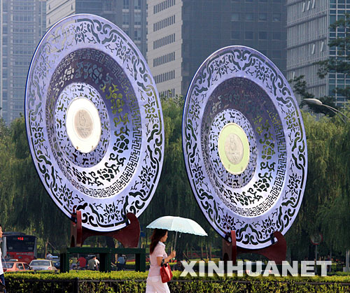 7月22日拍攝的北京復興門橋綠地中擺放的“藝術瓷盤”造型。奧運臨近,北京長安街上又增添了一批造型優美、別具一格的新景觀。新華社發