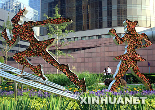 7月22日拍攝的北京中國國際貿易中心旁一組體育運動造型花壇。新華社發