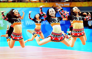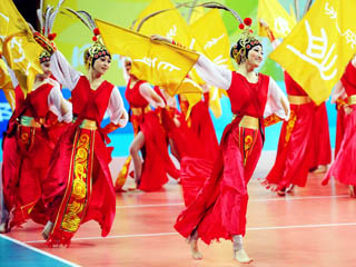7月20日,志愿者們在進行民族民間舞蹈表演。當日,北京奧運會、殘奧會體育展示與頒獎儀式工作匯報暨誓師動員大會在北京理工大學體育館舉行,集中匯報展示了北京奧運會、殘奧會頒獎儀式服裝及頒獎儀式標準流程、競技拉拉操表演、民族民間舞蹈表演和吉祥物表演等項目。