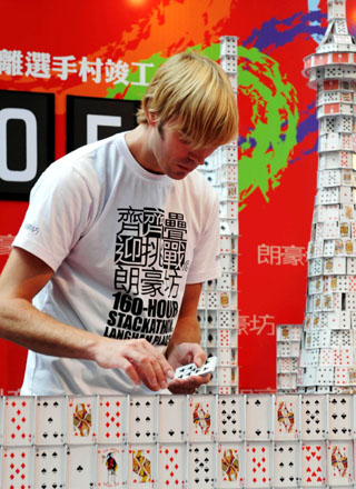 7月20日,美國藝術建筑師、吉尼斯世界紀錄保持者伯格在香港朗豪坊內用紙牌搭建“奧運村”。他自7月5日起在香港朗豪坊進行馬拉松式疊紙牌,徒手用14萬張紙牌搭出以北京奧運會為主題的紙牌建筑群,包括“鳥巢”“水立方”以及奧林匹克水上公園等,計劃于7月24日完工。